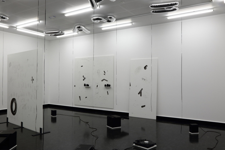 Installation, dry marker pen and acrylic screen print on whiteboard melamine, silver foil helium ballons, ribbon, t-shirt, reclaimed jars, FOAM record archive, record player and speakers
