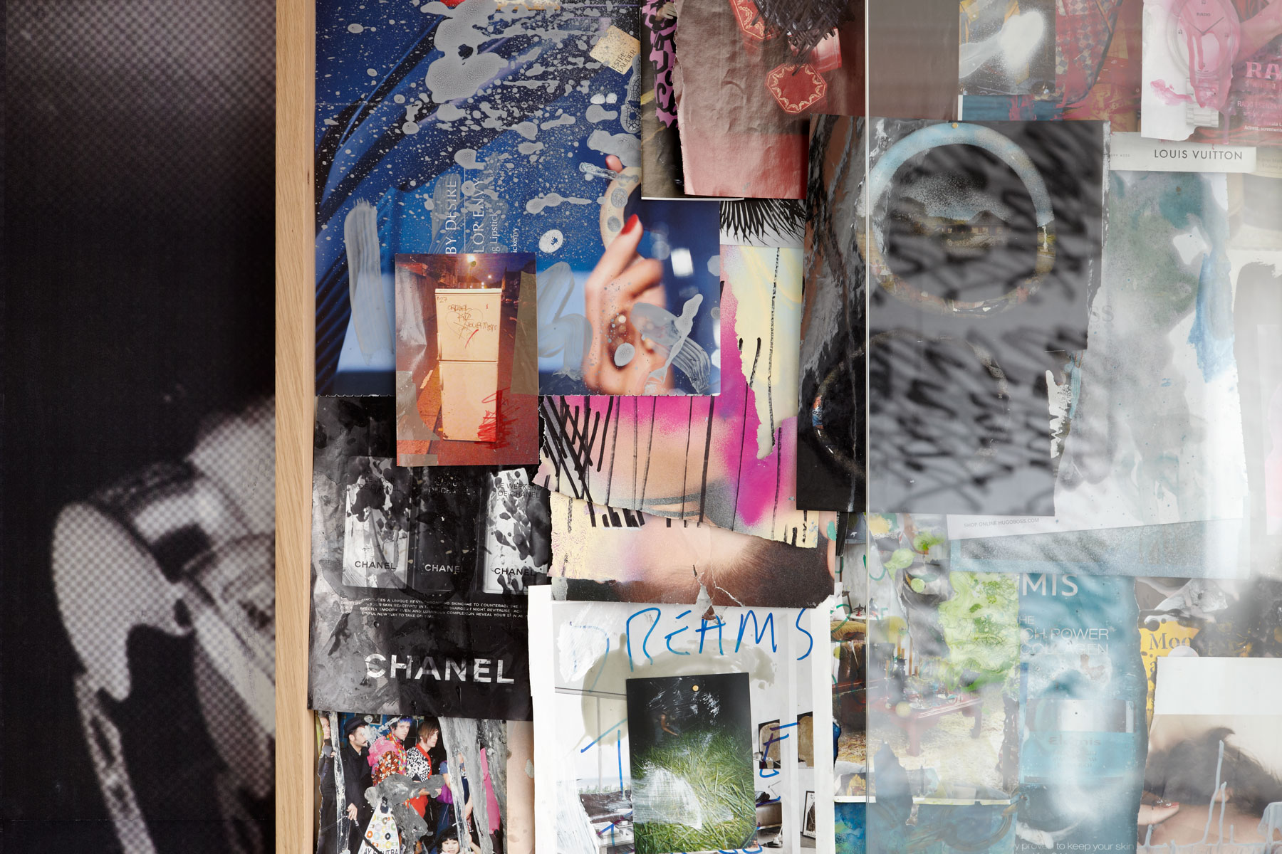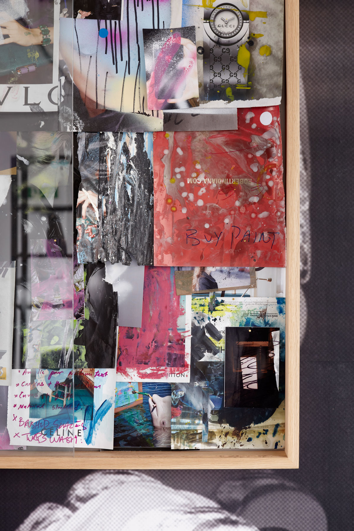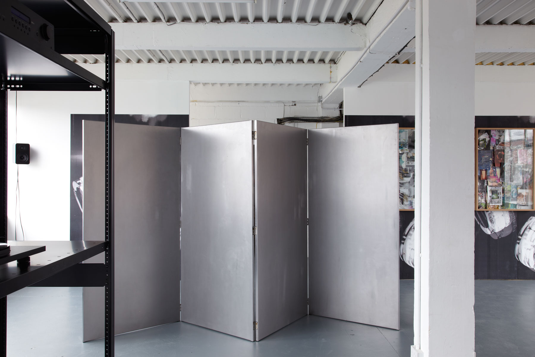 Blueback posters, FOAM archive, powder coated black dexian, oak display case, magazine pages, waxed mild steel